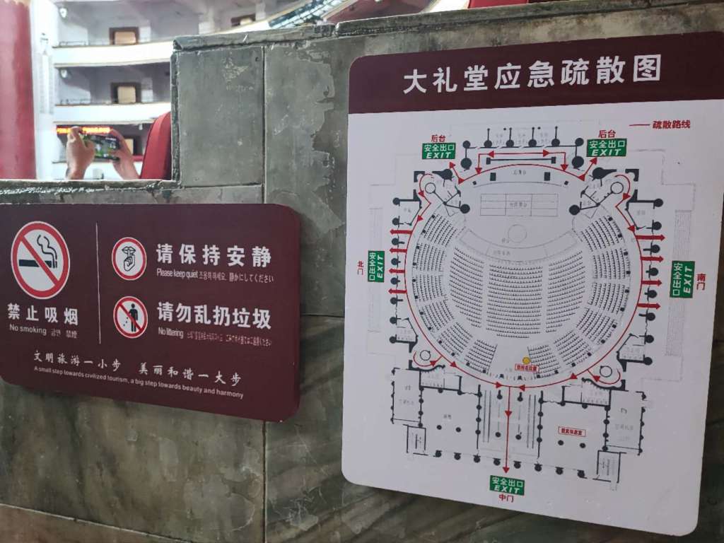 礼堂に入ると一番最初に案内板が貼り付けられています。その案内板を見ると礼堂の全体像が分かり非常に面白いです。例えば、柱の数、入口や出口の数、客席がどのように広がっているか、など細かく書かれているからこそ深く知ることが出来ます。礼堂を観光する際はぜひ一番初めに避難経路図を見てみて下さい。