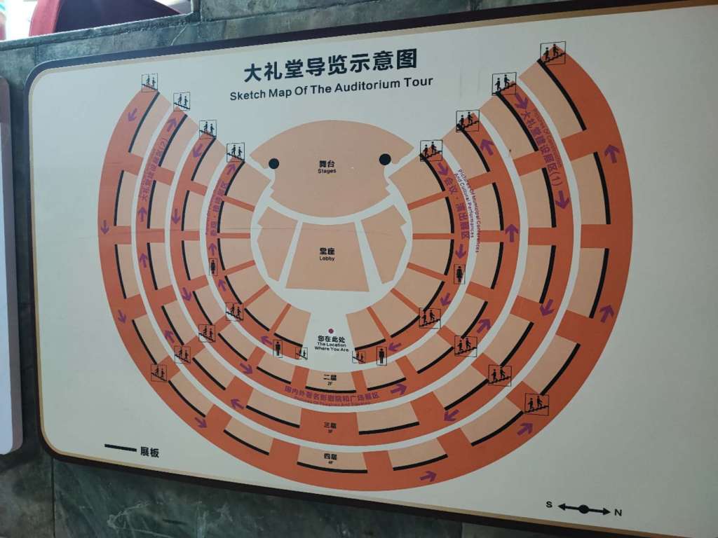 人民大礼堂の階段を上って、後ろを振り返ると人民広場が見渡せます。この二つの場所の位置関係はさえぎる物がなく、ちょうどまっすぐになっているので、少し階段を上るだけで全体を見渡せるようになっています。立て看板がおかれているので、その位置関係をはじめに知っておくといいでしょう。